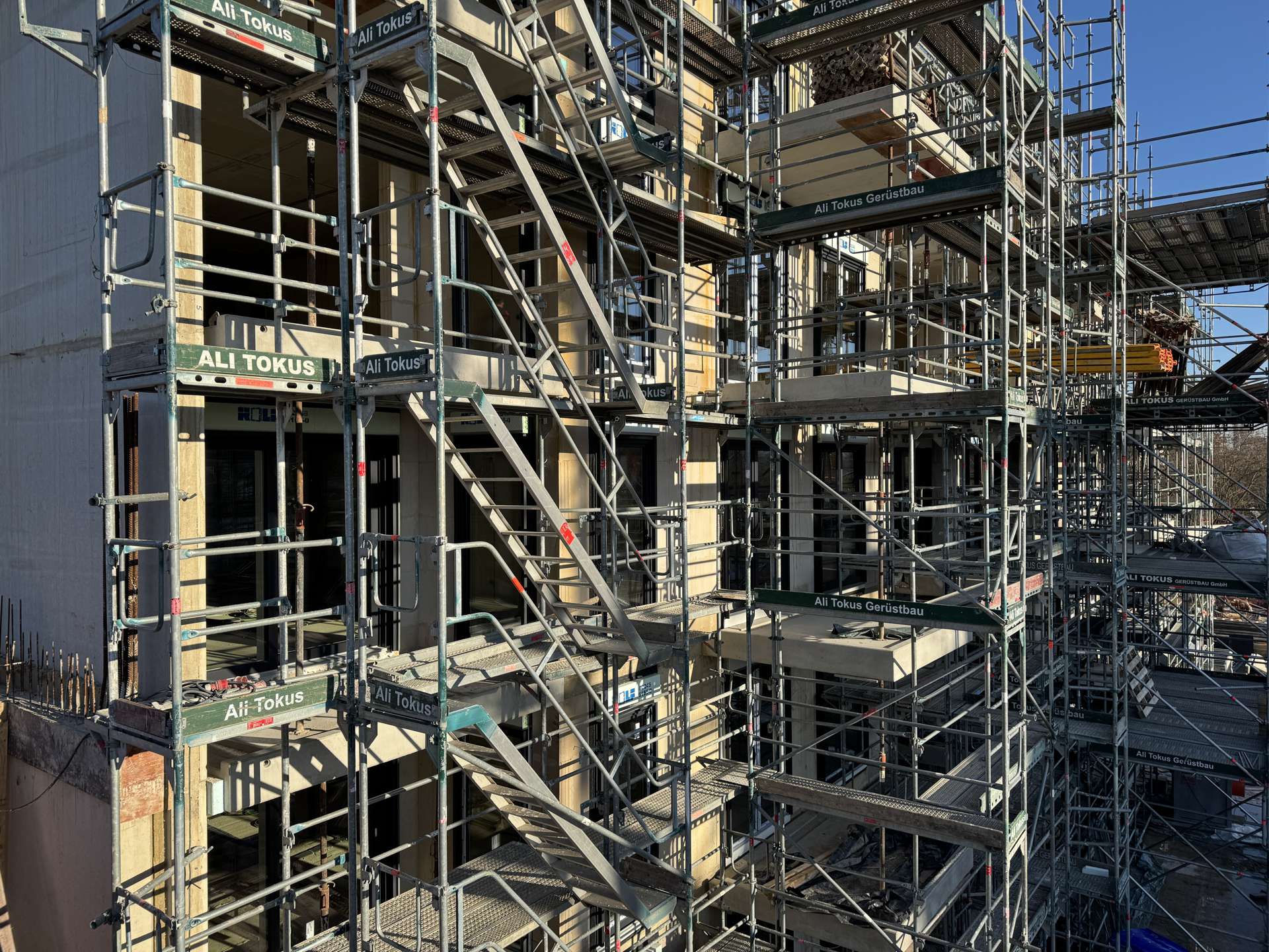 Auch außen nimmt das Projekt zunehmend Gestalt an: Fassadenarbeiten sowie die Arbeiten der Dachdecker haben begonnen und verleihen den Häusern nach und nach ihr äußeres Erscheinungsbild. Mit jedem Baufortschritt wird deutlicher, wie das neue Quartier wächst und sich harmonisch in seine Umgebung einfügt.