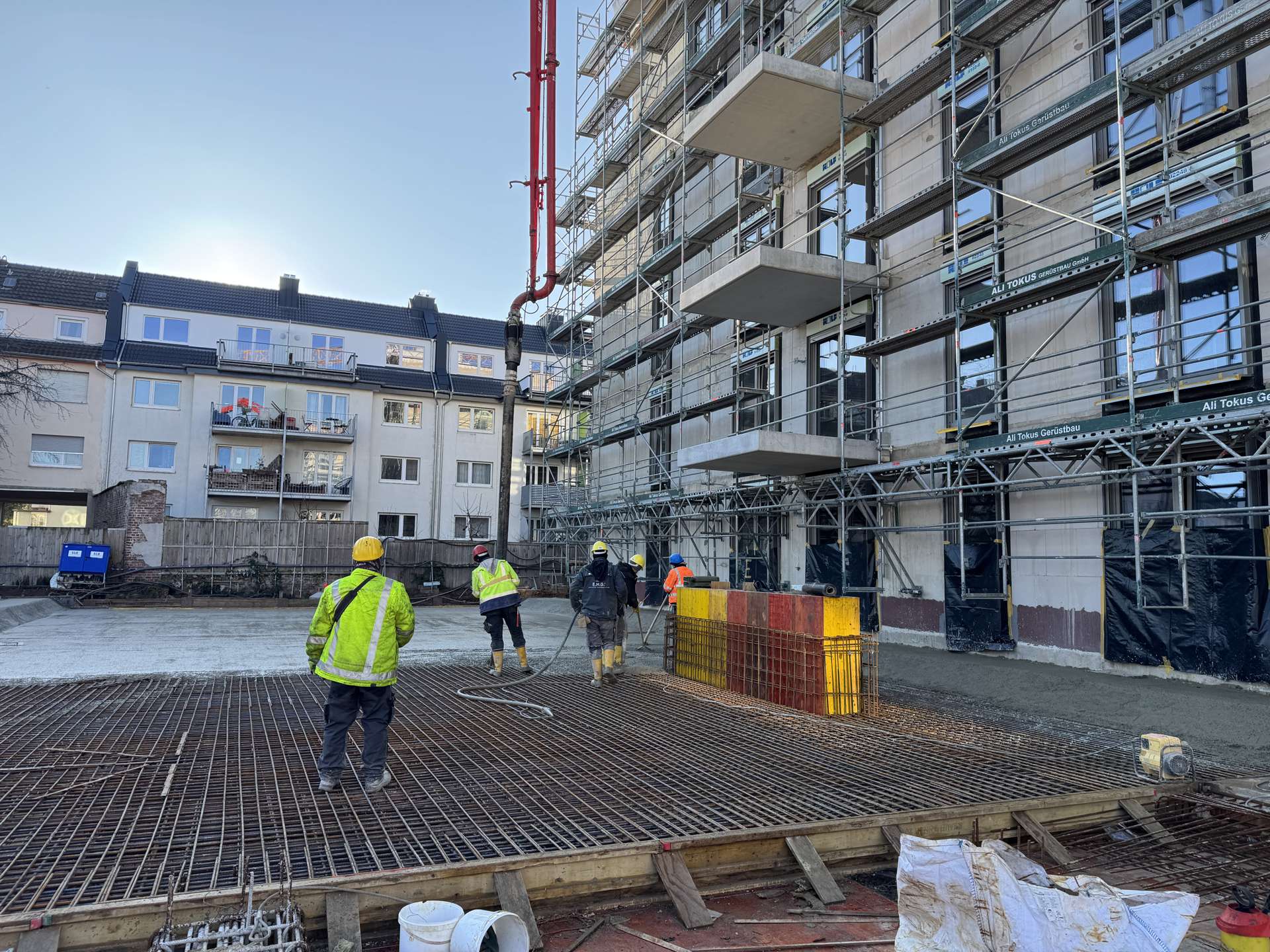 Auf unserer Baustelle an der Alsdorfer Straße ist in den vergangenen Wochen sichtbar viel passiert. Umso mehr freuen wir uns, einen wichtigen Meilenstein verkünden zu können: Der Rohbau des ersten Bauabschnitts ist erfolgreich abgeschlossen. Zu diesem Bauabschnitt gehören die drei Wohnhäuser Haus 4, 5 und 9. Insgesamt entstehen hier 57 moderne Wohnungen mit ein bis fünf Zimmern, die ein vielfältiges Angebot für unterschiedliche Lebensentwürfe schaffen – vom kompakten Apartment bis zur großzügigen Familienwohnung.