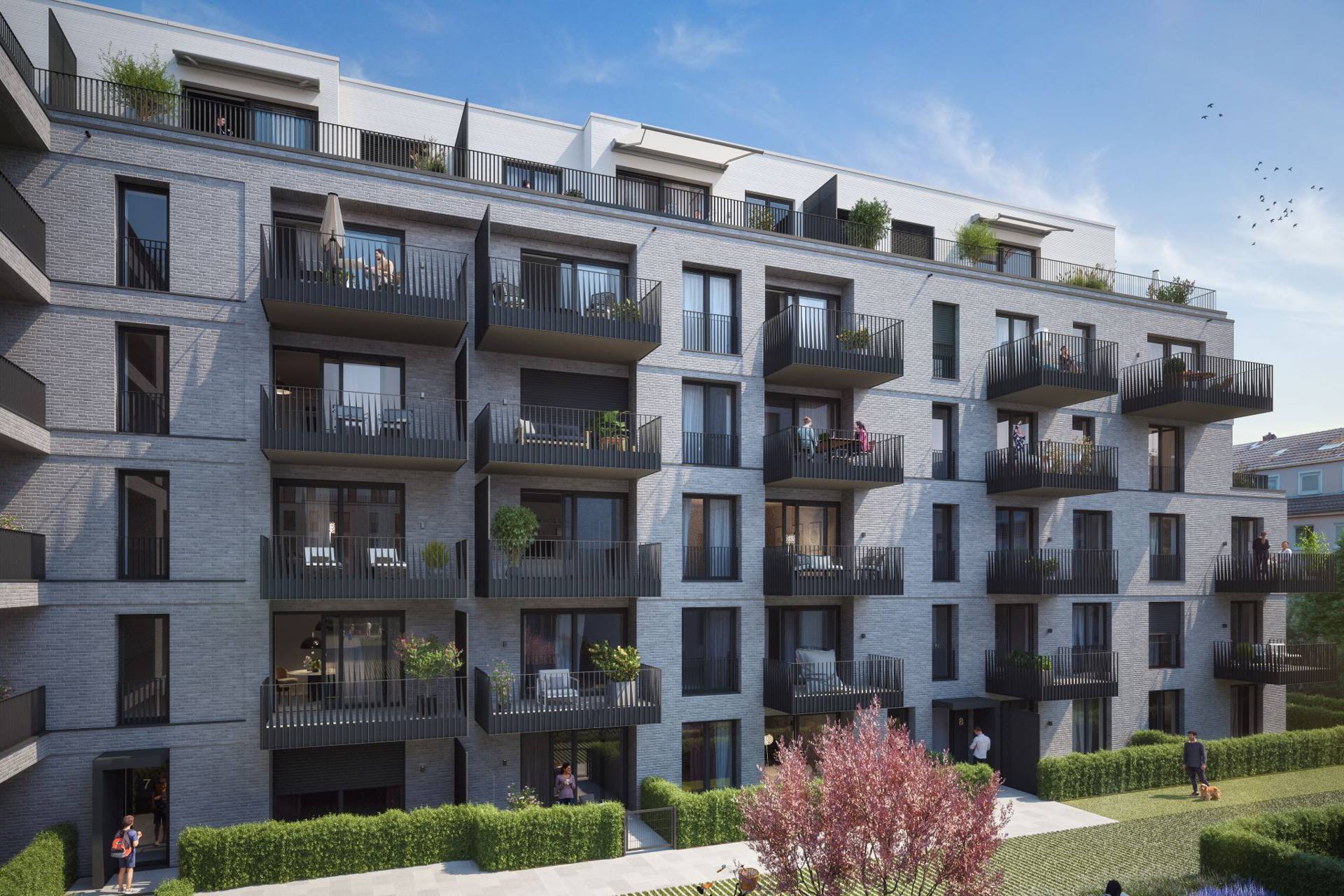 A total of 230 new flats are being built on a plot of around 15,000 square metres on Alsdorfer Strasse, supplemented by a daycare centre and generous open spaces. The 164 condominiums have private outdoor areas and are completely barrier-free - from the underground car park to the flat. PANDION COSY stands for sustainable, modern living in a quiet location with a green inner courtyard, sharing options such as electric cargo bikes and a high quality of life for families, singles and couples.
